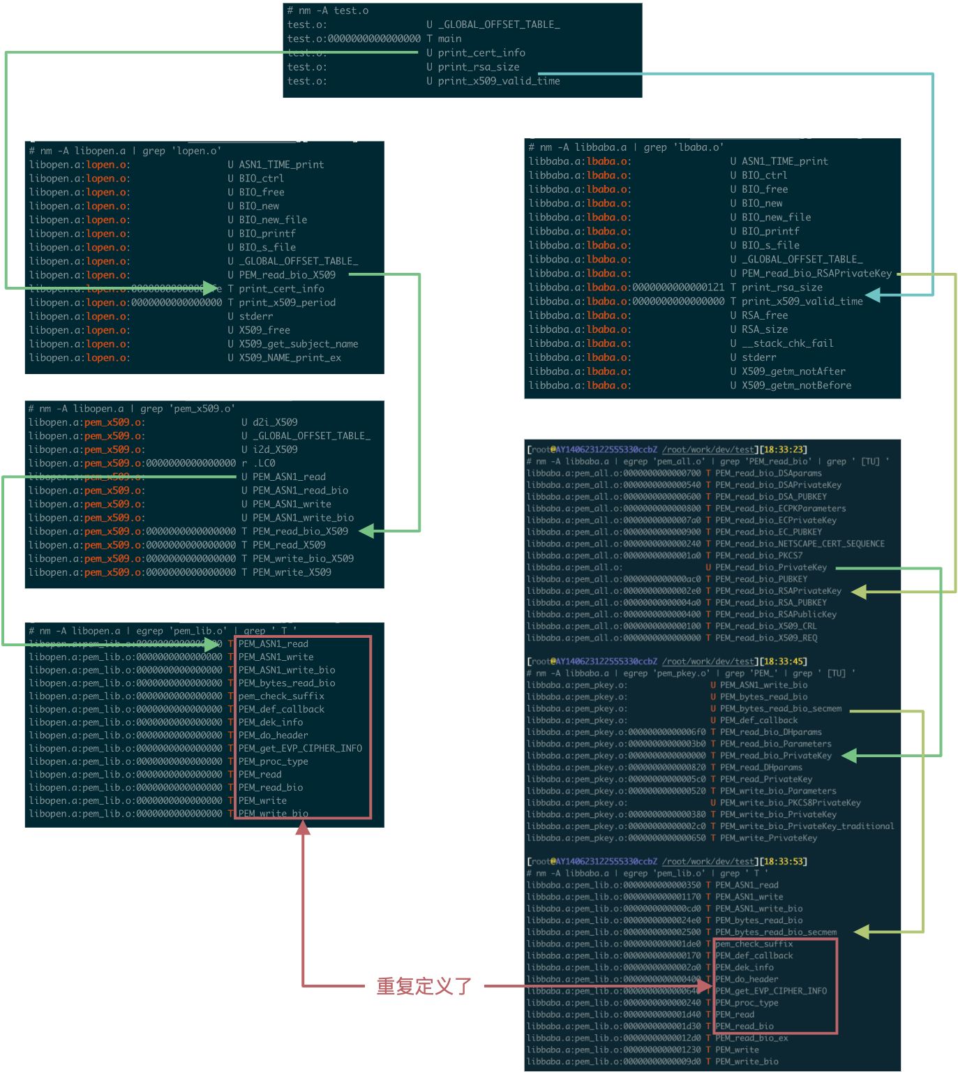 - lbaba.o 依赖外部定义的符号 PEM_read_bio_RSAPrivateKey,链接器会将 BabaSSL libcrypto.a 中的 pem_all.o 加入依赖列表中,接着去扫描 pem_all.o,然后将依赖的 pem_pkey.o 及其依赖的 pem_lib.o 也加入依赖列表中,这是 BabaSSL 中的 pem_lib.o,里面定义的函数与上面 openssl-1.0.2 的 pem_lib.o 的重复了,所以链接器报错,其他符号的重复定义也是这个原因;