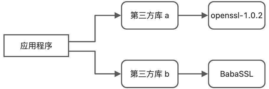 - 将依赖的相似静态库统一版本,比如上面的例子可以把 openssl-1.0.2 替换成 BabaSSL,这是最好的方案,但如果依赖 openssl-1.0.2 的静态库是第三方库,没有代码、无人维护或者不愿意改造,那就不好办了;